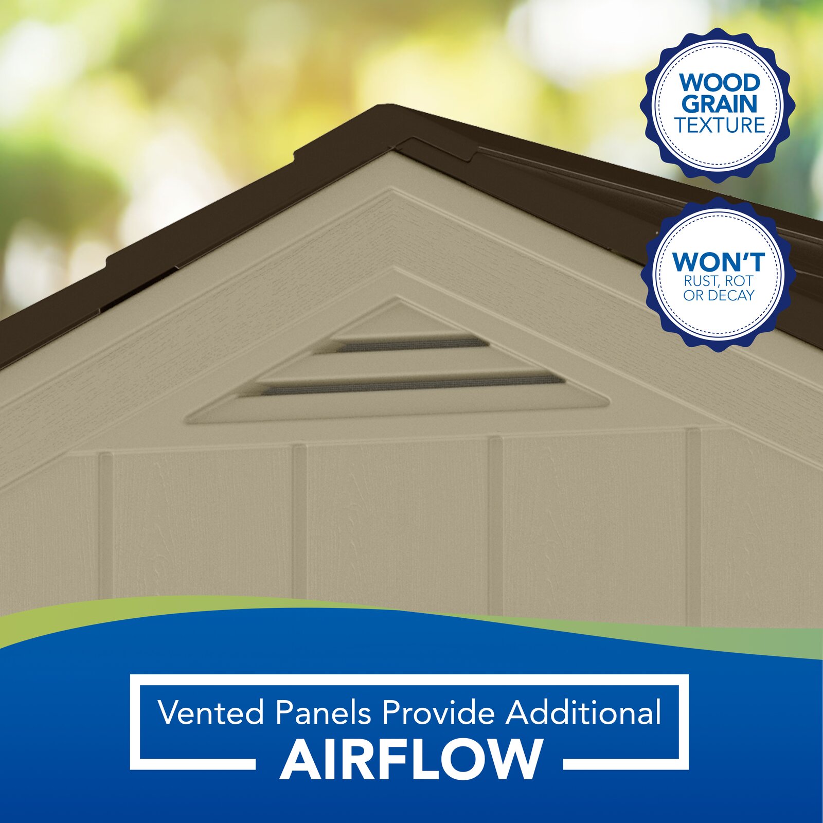- Classic shed design with architectural details and metal-reinforced shingle-style roof panels