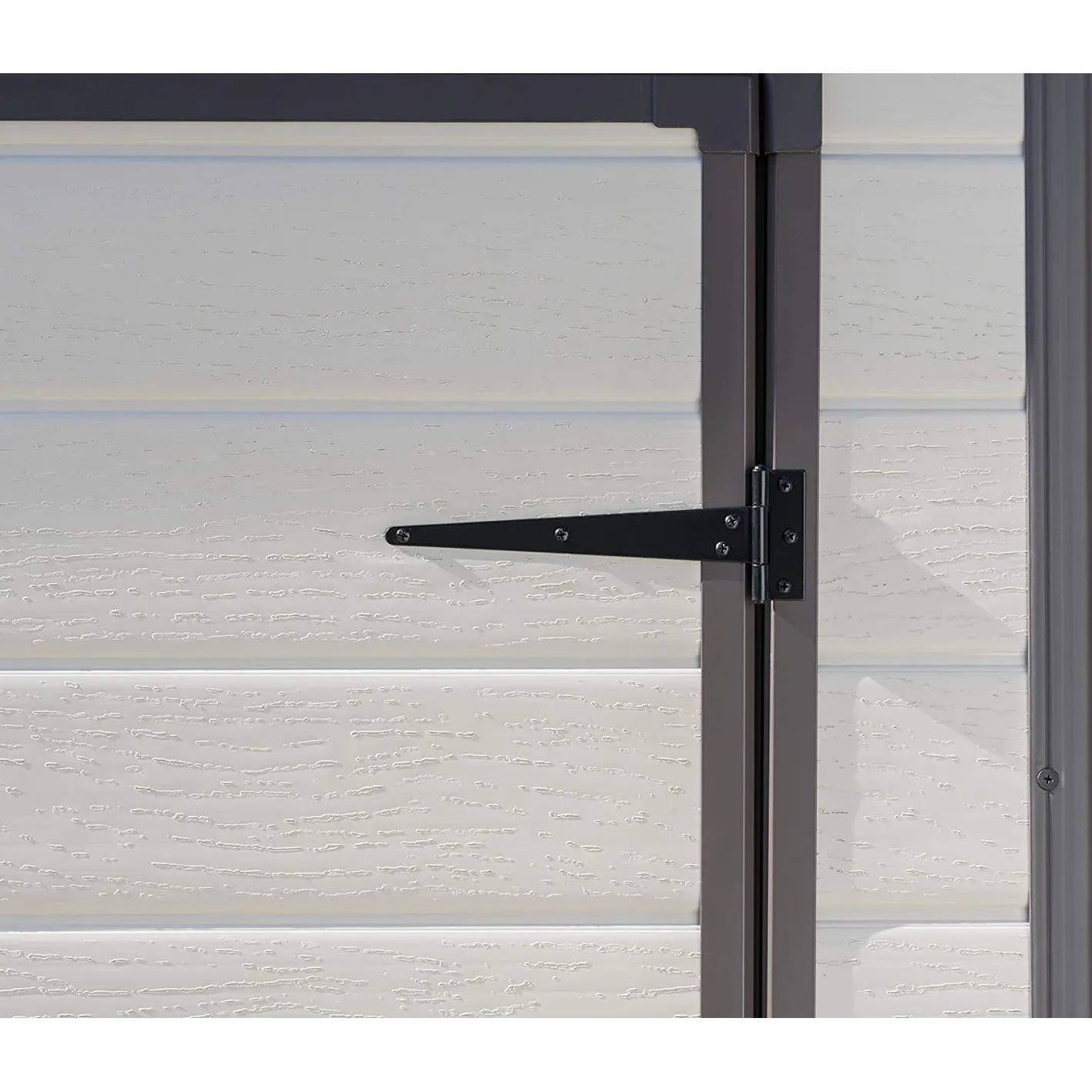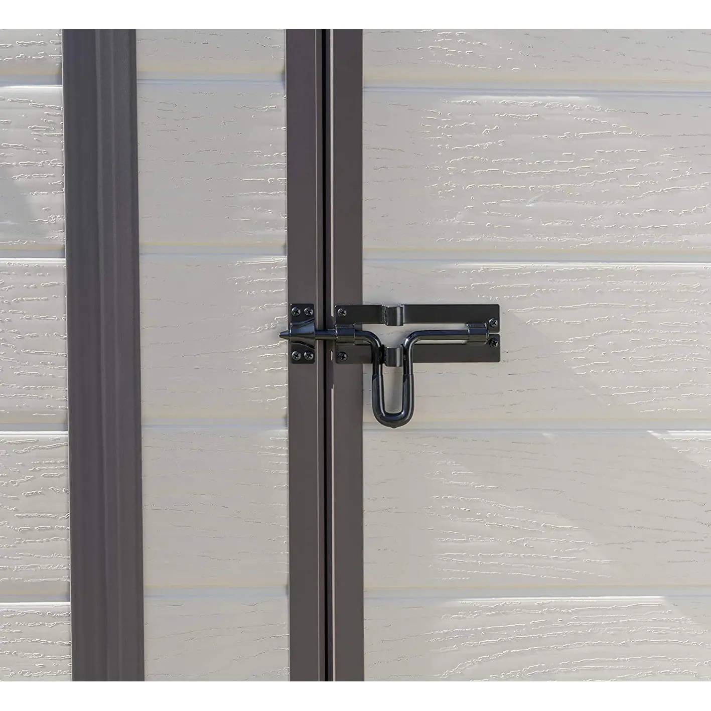 About this item Ideal outdoor storage solution for all garden tools and equipment, BBQ's, bicycles and DIY tools Elegant wood affect exterior with single doors, plus ventilation ducts for air circulation Floor panel with integral window for natural lighting and padlock hasp for optional added security Made out of a durable, maintenance and fade-free weather-resistant Assembled external dimensions:183.5 x 111 x 200.5 cm (L x W x H); internal dimensions: 168.5 x 97 x 195 cm (L x W x H)