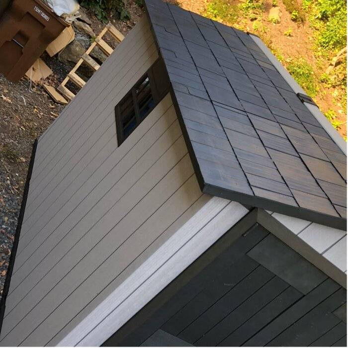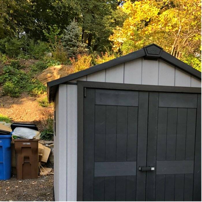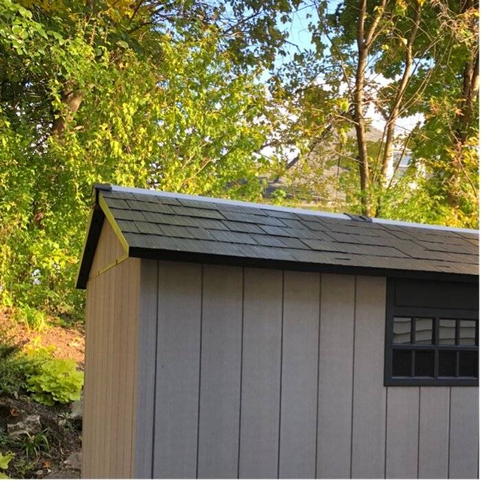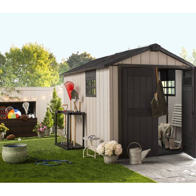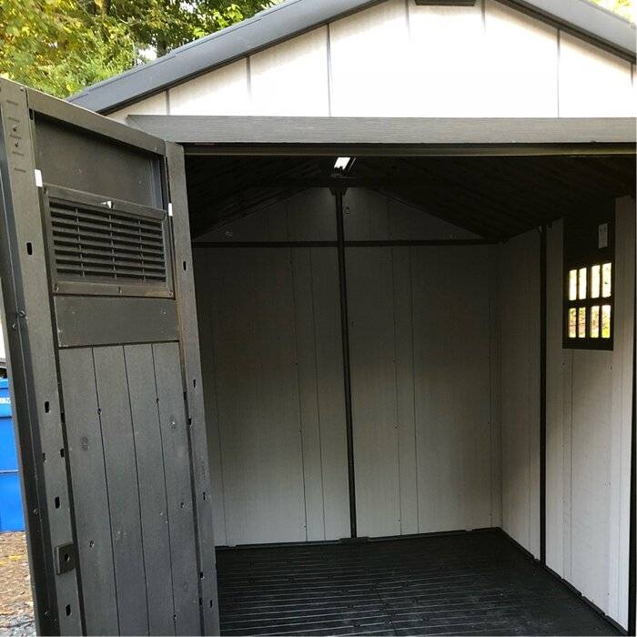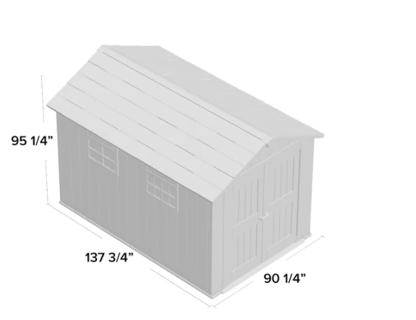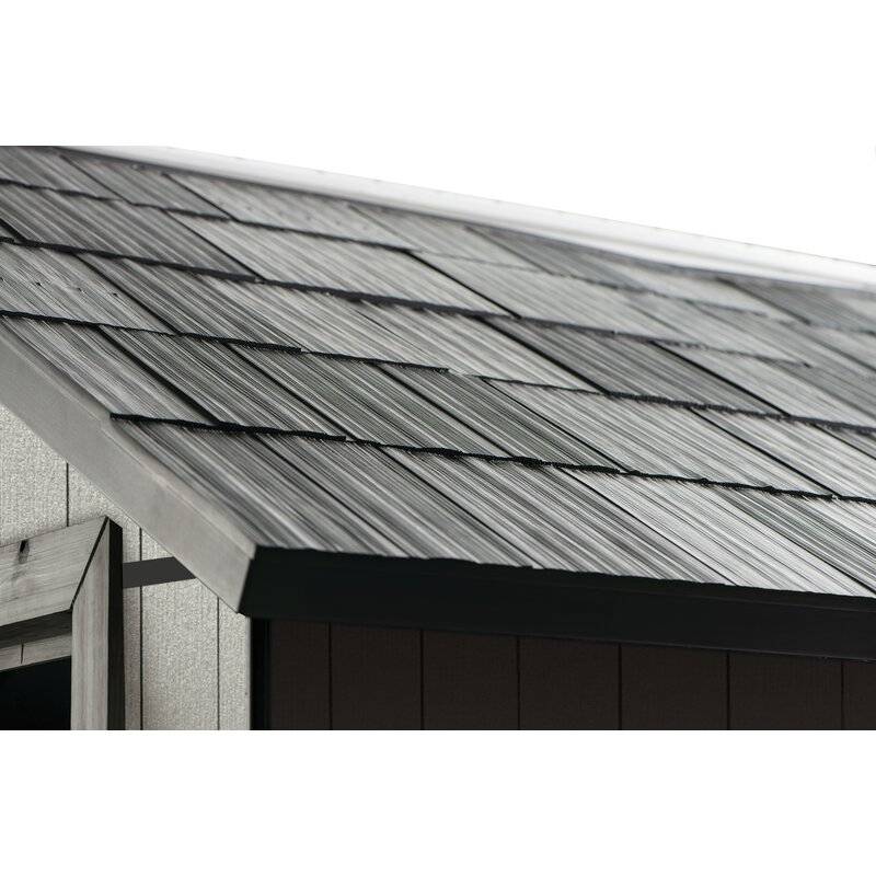 Description Bring plenty of sturdy storage and plenty of style to your backyard. The Oakland 11 ft. 5 in. W x 7 ft. 11 in. D Plastic Storage Shed, made from unique DUOTECH™ walls that give it a gorgeous weathered wooden texture, is engineered for maximum durability from top to bottom with a heavy-duty floor that can handle even your largest items, a weather-resistant double-wall structure and a super-strong roof that stands up to hefty loads of snow. Not only can the Oakland handle anything you can throw at it or in it - including large items such as lawnmowers and ATVs, but it looks good while doing so thanks to the DUOTECH™ walls that are paintable and can be customized any way you like, robust and attractive double doors for easy entry, a ceiling high enough for an adult to move around freely, a Victorian-style window and a skylight. With precut tongue and groove panels, it has a stainless steel locking system for added security. What's Included? Ventilation 2 Window(s) Floor Skylight Shed Double Doors Door Lock Features Unique Duotech walls are easily paintable & drillable to easily customize your space The innovative Duotech walls give it a gorgeous weathered wooden texture with all the durability of resin Super rugged and durable with a double wall structure, tongue in groove construction, and steel reinforcement Skylight & window to let in natural light & vented for air circulation Features double doors to accommodate larger lawn equipment Comes in precut tongue and groove panels for assembly made easy Resin texture readily accepts paint to match your style High enough ceiling for an adult to comfortably move around inside Storage capacity: 529.2 cu. ft. Product Details Shed Type: Storage Shed Primary Material: Plastic Storage Capacity: 529.2 cubic feet Wind Rating: 90 Additional Tools Required (Not Included): Screwdriver; Adjustable Wrench; Power Drill; Hammer Floor Included Floor Material: Resin