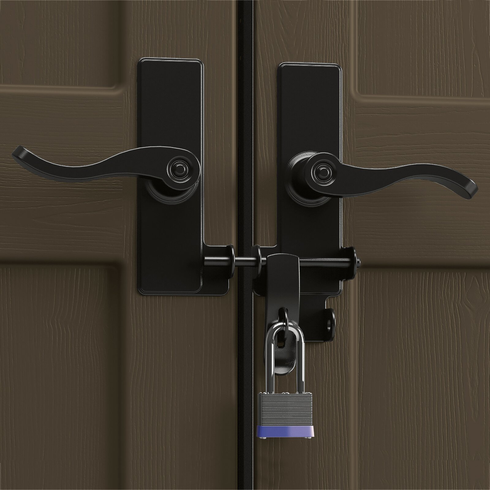 - Upper and lower metal latches keep doors closed and in place
