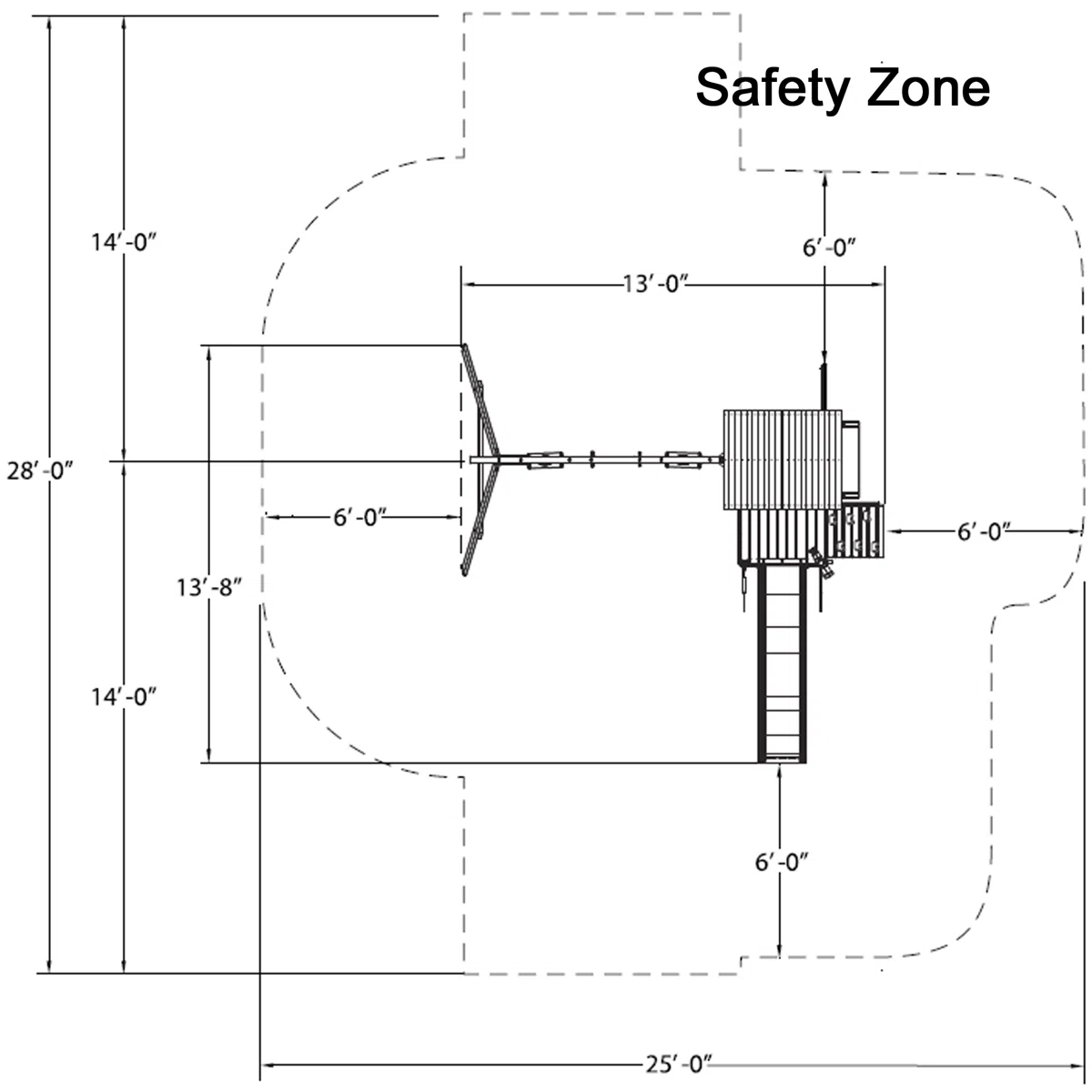 Overall 9' 7'' H X 13' 8'' W X 13' D Slide 3' H Overall Product Weight 369 lb. Chain/Rope Length - End to End 4' 10'' L Swing Beam Height - Top to Ground 6' 11'' H Recommended Safety Zone 700 square feet Beam Length - End to End 7' 9'' L