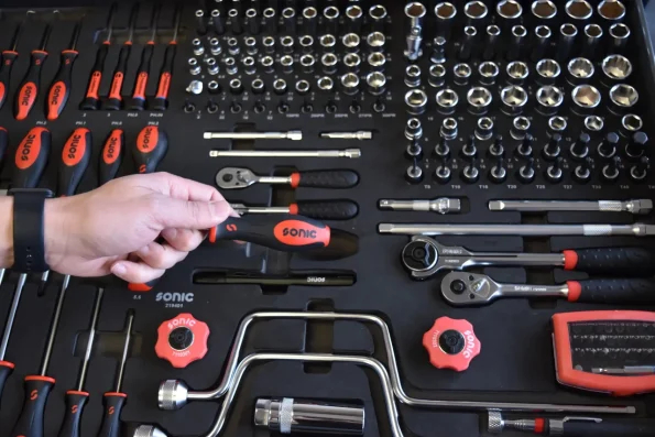This version of 13 drawer tool chest from NEXT S15 comes with a wide range of high quality tools (wrench sockets, spanners, screwdrivers, pliers and much more). No matter whether for your hobby room, workshop or garage, this tool cabinet is a perfect solution. Thanks to the integrated lock, 13 drawers can be locked at once which prevents the drawers from opening accidentally when the chest is being moved. The robust countertop on the tool trolley will be a great spot to keep frequently used tools within reach. Double paneled walls, body reinforcement and ball-bearing drawer slides for smooth action.